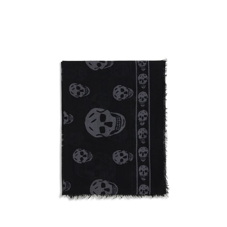 The McQueen Skull Scarf is made from a silk and modal blend in black and dark grey, featuring an all-over Skull motif. The fringed edges are enhanced with Skull details and the McQueen logo, creating a distinctive and contemporary accessory.