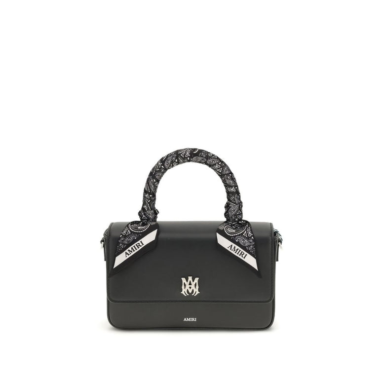 The Micro Long MA Handbag by Amiri is a sleek buffed leather top-handle bag featuring the brand’s signature refined details. The handle is wrapped with a bandana, and the adjustable, detachable crossbody strap allows versatile wear. Logo hardware and logo stamps appear on the face, along with a concealed front patch pocket. The magnetic flap closure opens to an interior equipped with a zip pocket, combining functionality with unmistakable Amiri style.