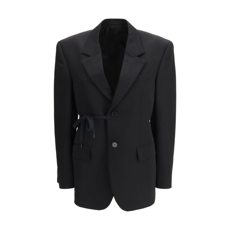 The Barathea wool tailored Jacket by Balenciaga redefines classic tailoring through a contemporary, refined lens. Crafted from premium wool with a compact hand feel, it features a classic collar and lapels with a clean single-breasted front that shapes an elegant silhouette. Long sleeves with adjustable buttoned cuffs, a chest pocket, and flap patch pockets echo traditional tailoring codes, while the drawstring detail at the waist introduces a modern, functional twist, allowing for a customizable fit. A sophisticated piece that balances formal precision with innovative design.