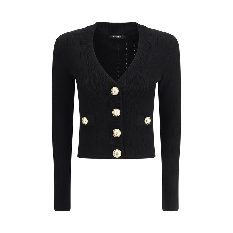 Cardigan by Balmain, cropped design, v-neck on front, closure by embossed buttons, close fit, monochrome pattern.