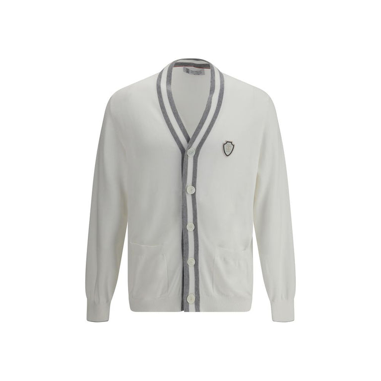 Brunello Cucinelli’s V-neck cotton Cardigan with front pockets is an iconic piece that combines elegance and practicality. It features a v-neck on the front, button closure and two welt patch pockets. The unmistakable monogram patch is applied on the chest, adding a distinctive touch. Ribbed cuffs and hem complete the design for a comfortable, finished fit.