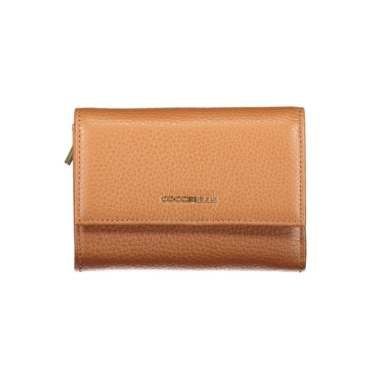 Indulge in the seamless blend of functionality and elegance with the Coccinelle Metallic Soft Wallet. Crafted in Italy, this brown leather beauty keeps your essentials organized with three compartments, dedicated card spaces, and an external coin pocket. Fasten your treasures with both zip and snap closure, while the iconic logo exudes exclusivity. A statement piece for the bold and trendy fashion enthusiast.