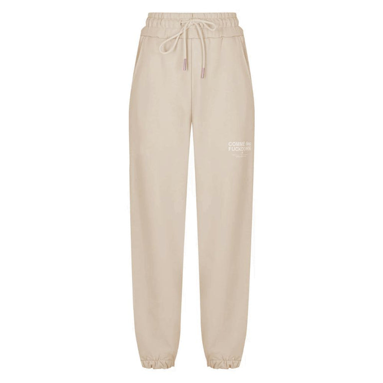 Embrace the irreverent spirit of Comme Des Fuckdown with these edgy beige sweatpants. A harmonious blend of comfort and statement style, they feature a bold front logo print to showcase your fearless fashion sense. With an elasticated waist and drawstring, these pants promise a perfect fit, while the elasticated ankles keep the look sleek and versatile. Perfect for making a standout impression while enjoying unparalleled comfort.