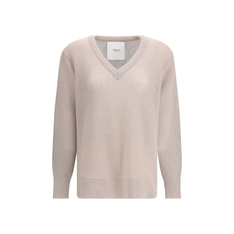 The mohair wool Sweater Giselle by Cruna embodies a refined balance of comfort and sophistication. Crafted in English rib knit, it features a soft oversized silhouette enhanced by a deep V-neckline and subtly padded shoulders. The mohair and wool blend provides natural warmth and lightness, ensuring effortless elegance for the colder season. A versatile piece designed to elevate everyday style with understated femininity.