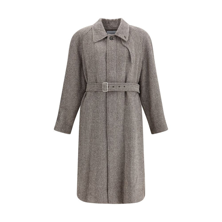 The Coat by Ferragamo is crafted from a refined herringbone-patterned fabric, showcasing timeless sophistication. It features a button-front closure and two front welt pockets. The structured collar includes an additional internal fastening with a concealed strap and buttons, offering both a tailored look and extra protection from the wind. Finished with a matching belt to define the waist, this piece reflects Ferragamo’s signature balance of craftsmanship, elegance, and contemporary design.