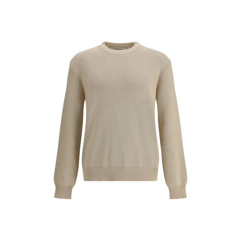 Beige ribbed-knit sweater by Golden Goose combines comfort and style. The crewneck and long sleeves provide a versatile fit, while the printed logo on the back adds a distinctive detail that makes the piece instantly recognizable. Perfect for casual-chic outfits or layered with more sophisticated pieces
