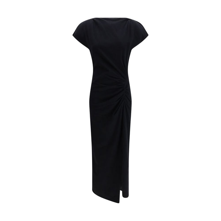 The Nadela Dress by Isabel Marant is crafted in cotton jersey and defined by a clean yet expressive silhouette. The boat neckline highlights the shoulders, while the removable snap-button straps offer versatility in styling. Short sleeves with turned-up cuffs add a casual note, balanced by the front pleating and slit that introduce movement and subtle sensuality. Long and body-skimming, this dress embodies a relaxed elegance with a contemporary edge.