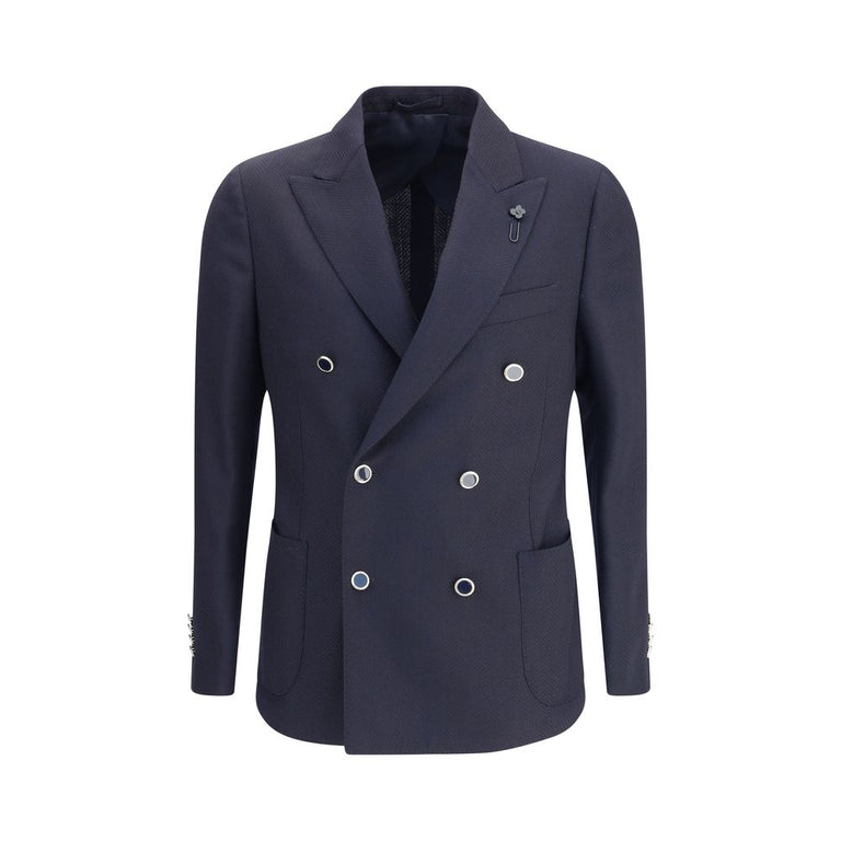 The signature virgin wool double-breasted Blazer by Lardini features six buttons, spear lapels and patch pockets. At the back, two slits ensure freedom of movement. The refined herringbone pattern enhances the brand’s distinctive elegance. The straight, structured silhouette is paired with a classic shoulder, creating a bold, contemporary look. Completing the design is the brand’s iconic pin on the lapel.