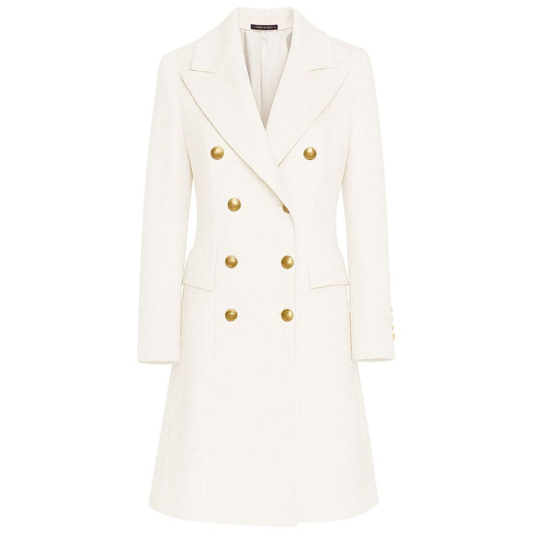 Elevate your outerwear collection with this pristine white double-breasted coat from Made in Italy. Crafted with sumptuous Loro Piana fabric, this virgin wool masterpiece exudes sophistication with sharp peak lapels and lustrous gold buttons. Its meticulous design includes two flap front pockets and a classic breast pocket, all brought together with a refined internal lining. Experience unparalleled Italian craftsmanship with this luxurious garment.