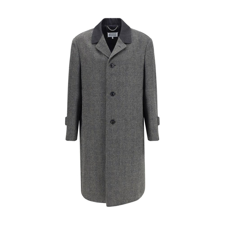 The Single-breasted coat in virgin wool blend by Maison Margiela reinterprets tailoring tradition with a refined, contemporary spirit. The defined shoulder structure and contrasting collar with classic lapels enhance the understated elegance of the design. The three-button front closure emphasizes its clean lines, while the four stitches on the back, the Maison’s unmistakable signature, reveal an iconic and discreet detail. A piece that blends sartorial rigor with a distinctive identity.