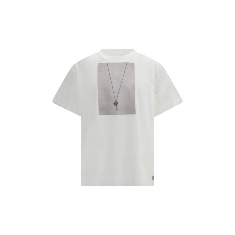 The T-shirt by MM6 redefines casualwear through a conceptual and contemporary lens. Crafted from cotton jersey, it features a digitally inspired key print on the chest, reflecting the brand’s experimental identity. Dropped shoulders, a ribbed crew neck, and the signature White Stitch Line at the back complete the design with a distinctive and recognizable touch.