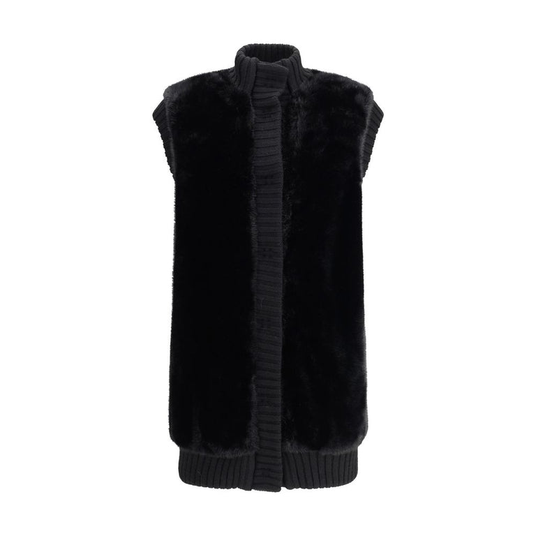 Long Vest in faux fur by Pinko, featuring a straight cut and ribbed knit details along the stand collar, concealed front opening, and armholes. Made from soft Aspen fabric with a faux fur effect, it offers a particularly pleasant and cozy feel.