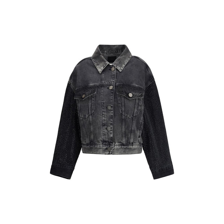 The Trucker jacket features a loose, slightly oversized fit with a workwear-inspired style. Made from rigid Black Cotton Denim with a stone-wash finish, it includes contrast patches and small faceted studs for added detail. The design features a shirt collar, flap front pockets with buttons, adjustable closures at the hem and cuffs, and a front button fastening. Pair it with matching denim for a standout coordinated look.