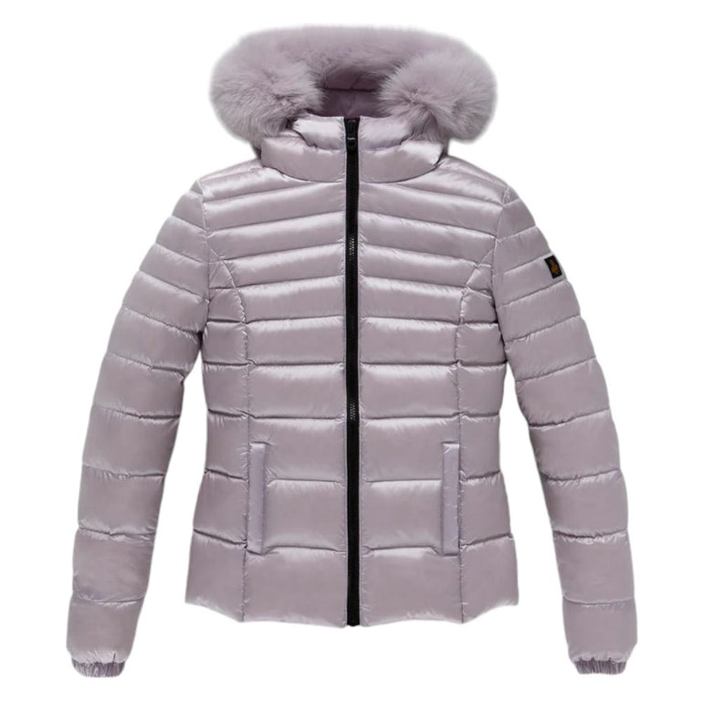 Wrap yourself in the fusion of luxury and comfort with this Regrigiwear women’s short down jacket. Crafted from premium nylon, this exquisite piece boasts a lush 100% feather padding ensuring warmth without the bulk. The fur-trimmed hood serves as a statement of your stylish sensibilities, while the zip fastening and side pockets deliver both form and functionality. Adorned in a majestic purple hue, it’s a garment designed for the bold and the beautiful.