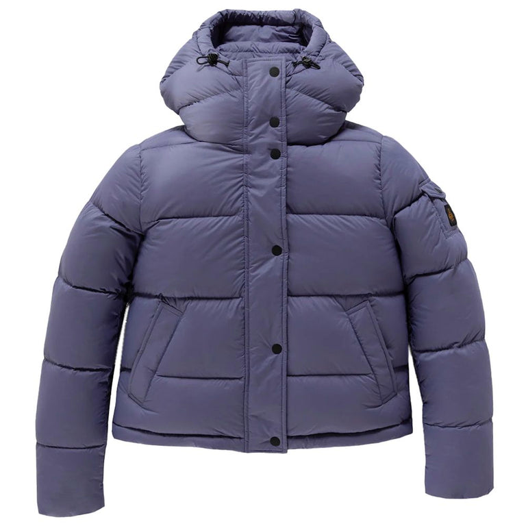 Refrigiwear short down jacket in opaque nylon with feather padding, hood with drawstring, button and zip fastening, two side pockets