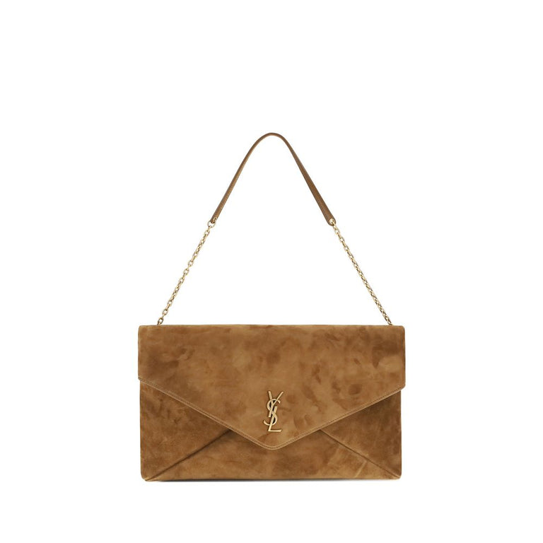 The Cassandre Shoulder Bag by Saint Laurent is an extra-large suede clutch with a sleek and contemporary design. Featuring a stowable cable chain and metallic CASSANDRE decoration, it can be worn on the shoulder or carried by hand for sophisticated versatility. Bronze-colored metal hardware adds a vintage touch, while the cotton-lined interior features a zippered pocket. The snap-button closure completes the design with practicality and style.