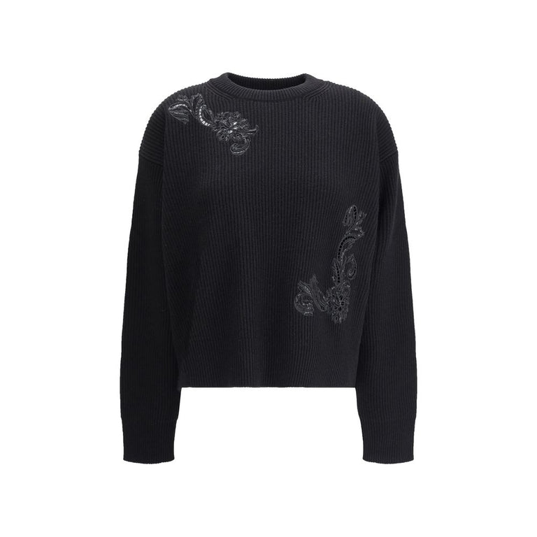 Versace’s Barocco Leaf Embroidered Sweater is an elegant knitted wool top embellished with a refined Barocco Leaf motif thread embroidery, enriched with cut-outs and tone-on-tone micropaillettes. The design features a classic crew neck, long sleeves and ribbed edges, offering a comfortable fit with a touch of sophisticated opulence typical of the house.