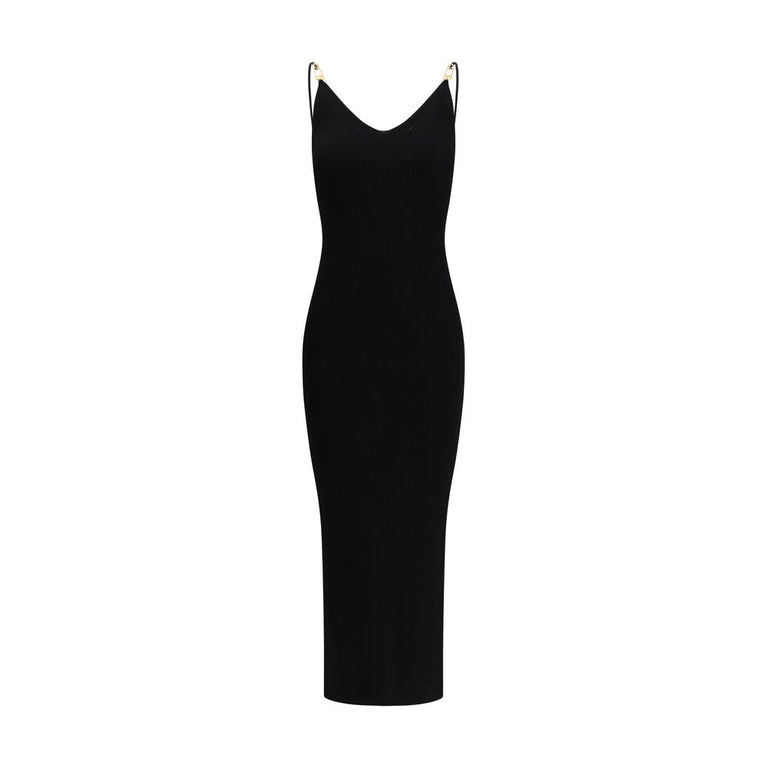The Safety Pin Slip Midi Dress by Versace features a fitted line crafted from stretch viscose knit, offering a controlled, body-skimming elasticity. The V-neckline is cleanly defined, while the ribbed texture adds structure and maintains a streamlined appearance. The Safety Pin detail and the Medusa Head motif introduce the house’s signature elements with subtle precision. A rear slit allows ease of movement, completing a silhouette designed for modern, effortless elegance.