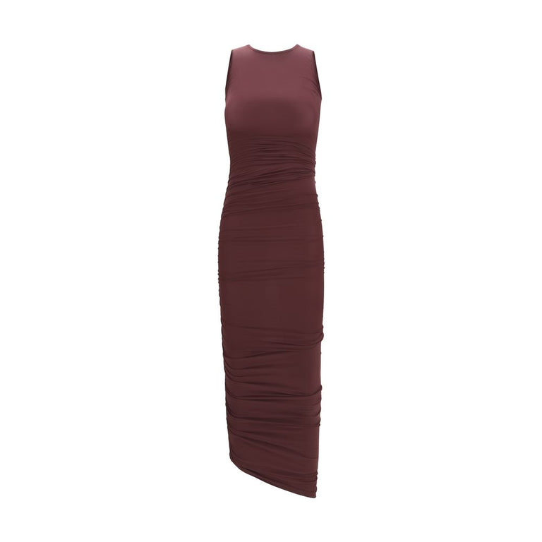 The asymmetric semi-sheer midi Dress by Wolford conveys refined sensuality through the brand’s iconic Individual Skin fabric, lightweight, silky, and subtly luminous. Its circular knit construction creates a seamless finish that skims the body in a slim silhouette, while the soft, uneven draping allows the hem to be adjusted for personalized styling. A round neckline and sleeveless design complete a modern, sophisticated look that feels effortlessly elegant.